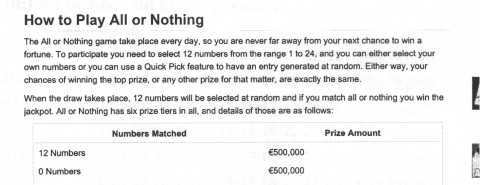 Imagine, now they want to sell you a game with 2.7 million combinations but not pay you the advertised jackpot amount if you win by playing one of 4 combinations that they told you to play. There is something terribly wrong with this picture. The definition of a "design" problem - well, this means that because they failed to realize that all tickets with either all odd numbers and all tickets with even numbers would ALL win $250K if either was drawn - they failed to protect the state of Texas with the rule and the rule as adopted was NOT TRUE and CORRECT as signed. You really need to understand the impact - none of these people - from G-Tech to the Commissioners to the Executive Director to his entire staff including those in legal, products, marketing and Finance did a simple math test. How could this many people fail to see the potential winnings - with gigantic losses to the state - for one drawing with a top prize of $250K especially when they STRONGLY and ADAMANTLY encouraged players to play a "propensity of certain number combinations?" I saw it immediately. Shoot, they can't even raise enough money from ONE DRAWS sales to fund $200K in Texas 2 Step yet they think the state can afford to pay $250K FOUR (4) times per day on this one game???? Oh gee, I forgot - you're not suppose to win the top prize in this game - you're just suppose to donate your money for the school children of Texas - but wait - the poor school children did not receive their 38% of sales from this game. This is what the legislature failed to write into law - that " from all draw games, 38% of sales is earmarked/mandated for the School Foundation Fund." Anyway, it appears that Mr. Grief is of the belief that because sales were greater than projected (this in itself means finance screwed up) - that the schools did receive enough money or more than planned for them to receive so the actual percentage shouldn't matter. This is the same stinkin' thinkin' as an employer who thinks that a commissioned sales person has made enough money this week so he can reduce the sales persons commission rate. WRONG - WRONG - WRONG. 38% percent is owed to the School Foundation Fund - PERIOD. To me, ONE of Gary Griefs biggest mistakes was in his statement to Michael Anger - "... not feel shackled by the traditional parameters that were placed on daily draw games; and that is, limiting yourself to two drawings a day or limiting yourself to a 50 percent payout." Gary, for your information, anything greater or lower than than 50% would be screwing somebody - players or state. Which one were you intending to screw? Yesterday, the Commissioners made an excuse for the Texas Lottery and G-Tech - they said it was a new game that has never been played before so they were entitled to a mistake. G-Tech actually told the Commissioners that All or Nothing has never been played in "this jurisdiction" - which means in the US. I'm not sure that the Commissioners understood this nor am I certain that folks who will read the transcript will understand what it means either. But folks, All or Nothing WAS played in Ireland exactly as it was played here - pick 12 of 24 numbers. So, to me and in my opinion, G-TEch lied because there IS a history of how the game performed and it should have been presented to the Commissioners at the time they proposed to play the game. I showed a G-Tech employee where it was played in Ireland (shown below) - he said he had no knowledge of it so I said, "Well, it was called All or Nothing in Ireland too. I wonder, could there be a problem with a trademark, copyright or patent for TX?" He said, "Oh NO, we took care of that!" Well, looks like he did know it was played in Ireland! Folks - G-Tech is an international company and they have resources - they can find out anything they want to know from a lottery anywhere in the WORLD. But they told the Texas Lottery Commissioners that because its never been played in this "jurisdiction," they had no history of how the game performed. Baloney! Virtually everything the Lottery has ever done was initiated somewhere else first - guess our Commissioners didn't know this.