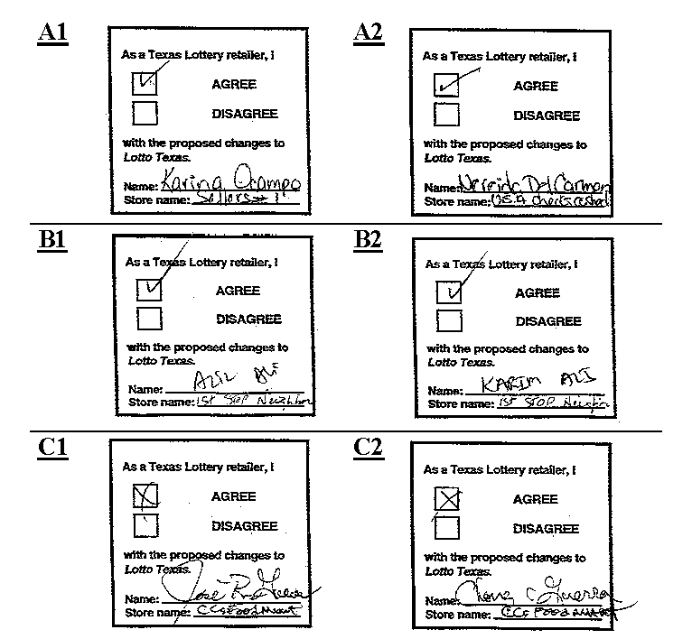 Upon conducting the preliminary examination I found that numerous of the "Store name" lines were filled out by the same individuals. As this was not the main purpose of the investigation, but to determine if the signatures were actually filled out by the same individual or individuals, I did not quantify my findings. In my opinion, subject to the examination of the originals, it is highly probable that same individuals wrote the signatures below. Same alpha letters signify that signatures were by same individual. Copies of all surveys referred to below are attached: