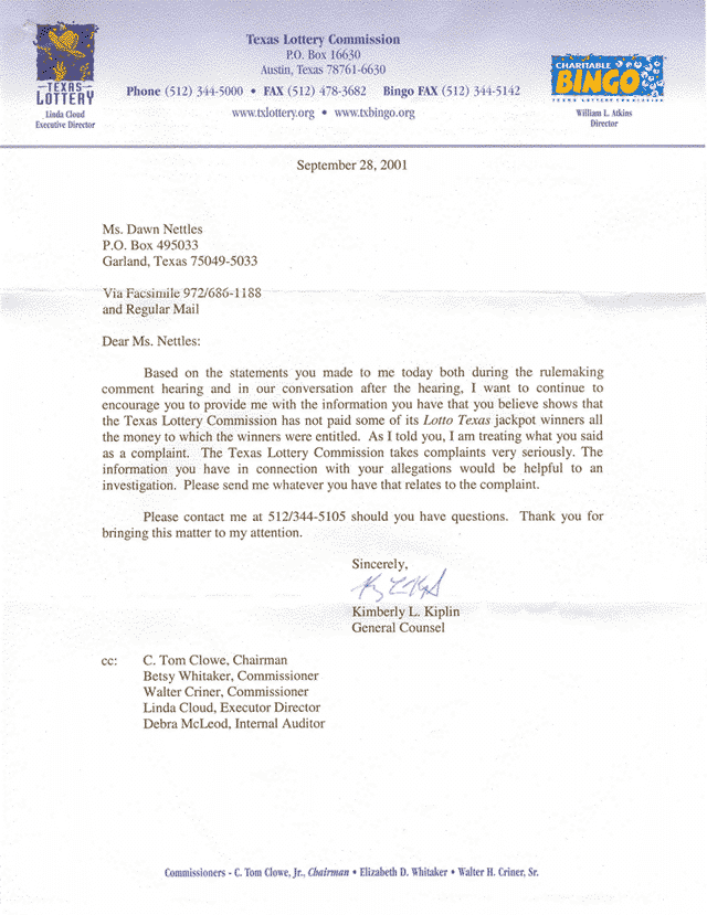 - 1 - A letter dated September 28, 2001 from Kim Kiplin. It confirms there