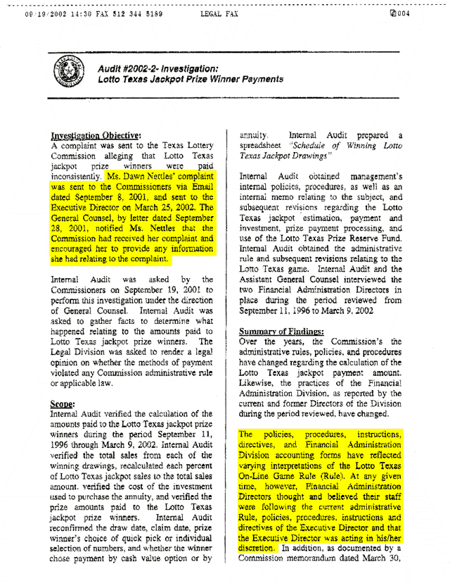 - 3 - Internal Audit Investigation #2002-2. The TLC faxed this document to me. The first paragraph, "Investigation Objective," please notice that it states my It took the TLC one year to confirm my "allegations." This was simply a stall. If you want the entire 10 pages, I'll be happy to fax them to you or